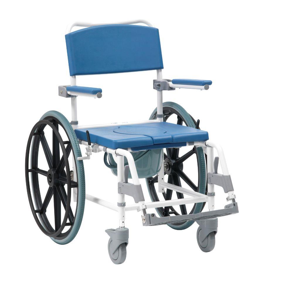 The Aston self-propelled aluminium shower commode with a 160 kg capacity. Rustproof frame, flip-up armrests, and quick-release wheels for patient use.