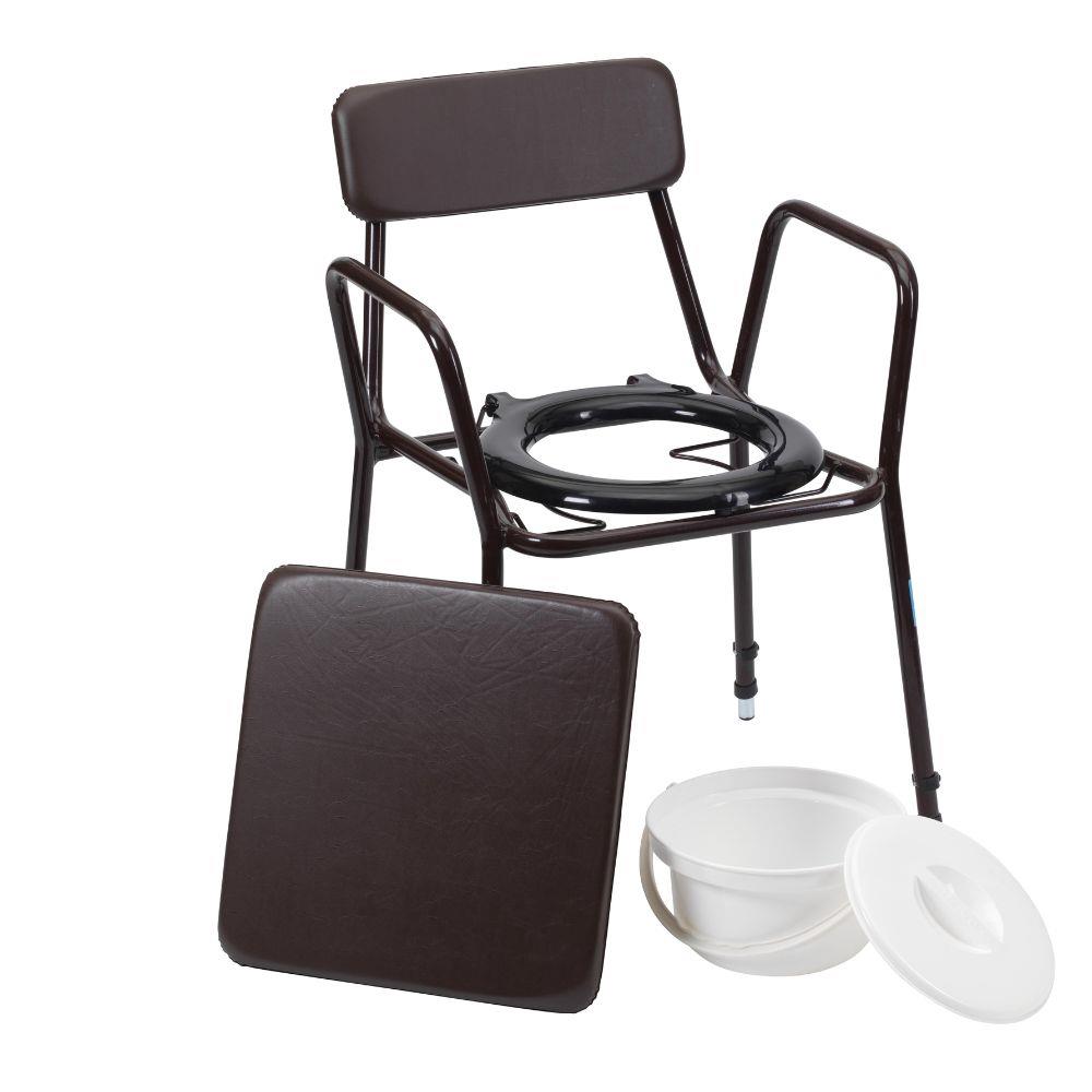 The Stacking Commode is made from high quality steel tubing, with a tough brown coating for durability. The commode can be used anywhere in the home.
