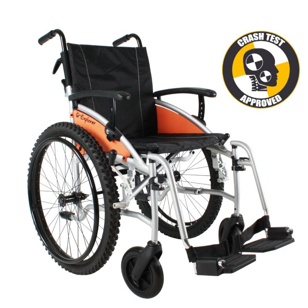 The G-Explorer, an all-terrain self-propel wheelchair, features mountain bike tyres and a robust frame for outdoor use.