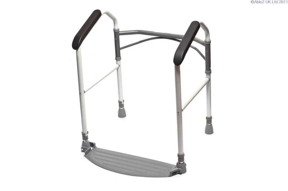 The FoldEasy Toilet Frame folds conveniently when not in use and is height adjustable. The user should stand on the footplate when positioned on the floor which