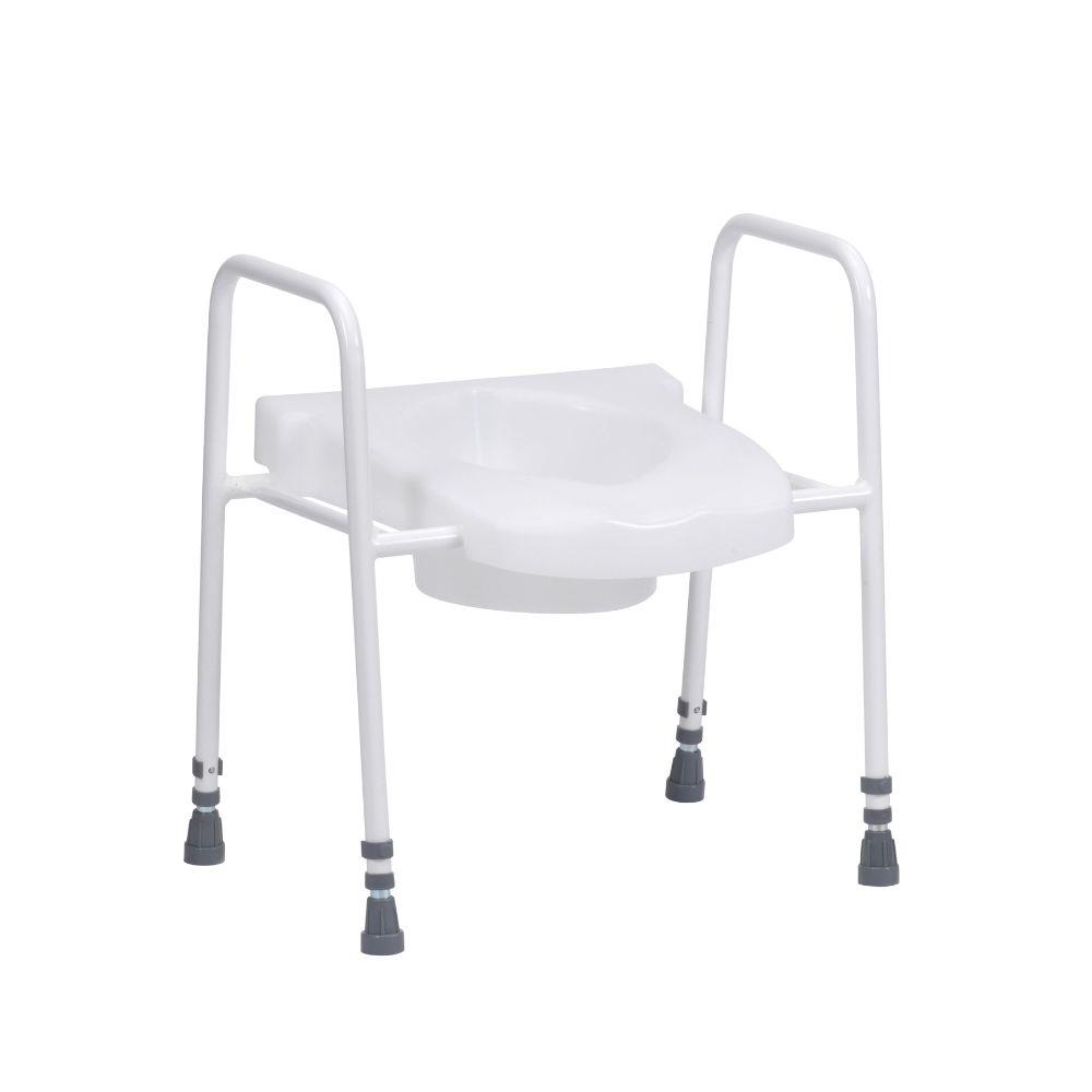 A height-adjustable over toilet frame with a clip-on injection-moulded seat. Features a sturdy steel frame with a 190 kg (30 st) patient capacity.