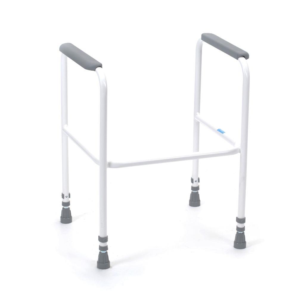 A freestanding, rigid toilet surround frame with double struts for stability. Coated steel with moulded armrests to support users up to 180 kg.